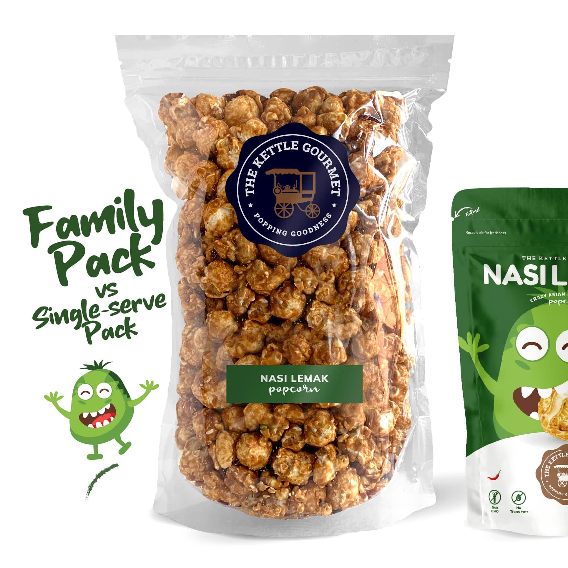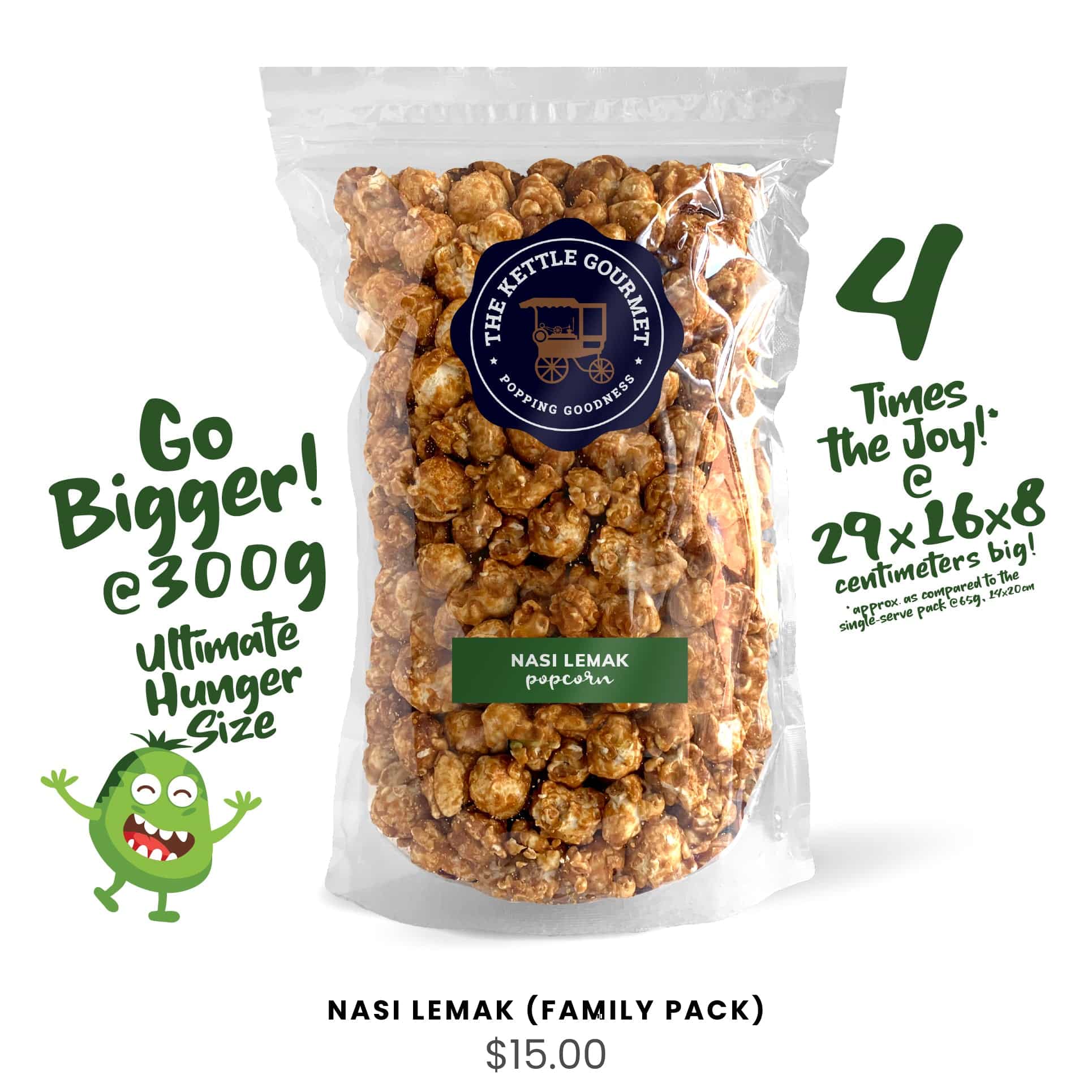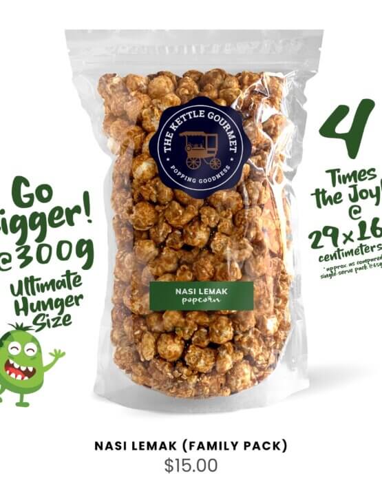 The Kettle Gourmet’s Nasi Lemak reminisce your fondest memories. Savoury, crunchy, popping goodness your buddy probably thought you’re just being emo. But who really cares. Part of the Crazy Asian Flavoured popcorn series.