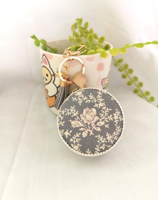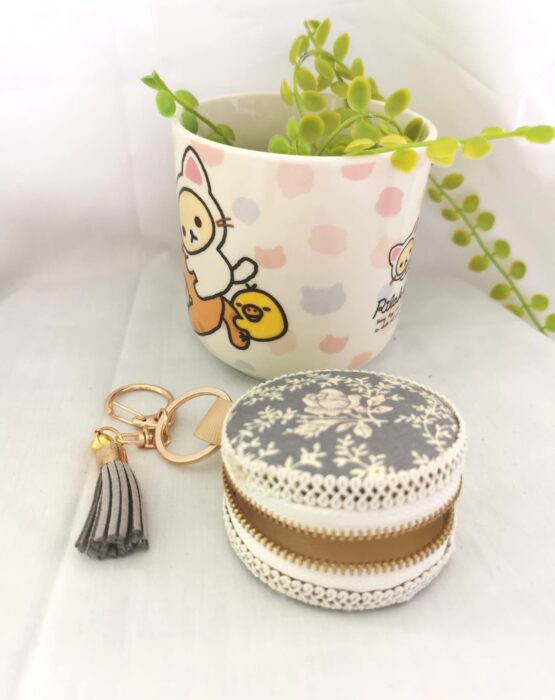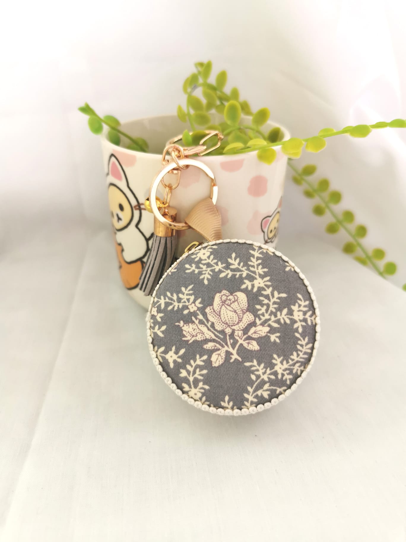Vintage purple grey roses hand crafted macaron concept pouch / bag charm with zipper for jewelriesaccessories, coins and earpiece; doubled up as a keychain. Meticulously finished with good quality fabrics of various designs. Every piece is intricately hand sewn to its finest details. Ideal gift for all occasions.