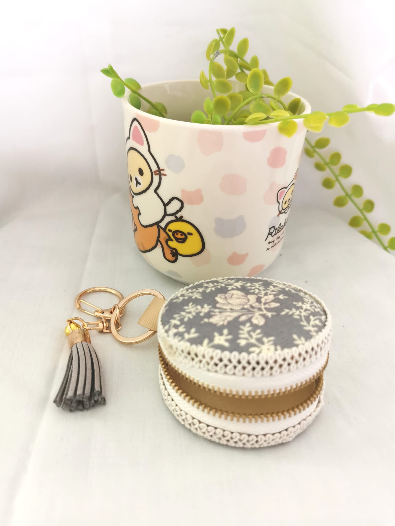 A macaroon inspired metal casing enclosed with fine fabric, coupled up with a tassel and a bell charm; ideal for storing your coins, jewelry, ear pieces & more.